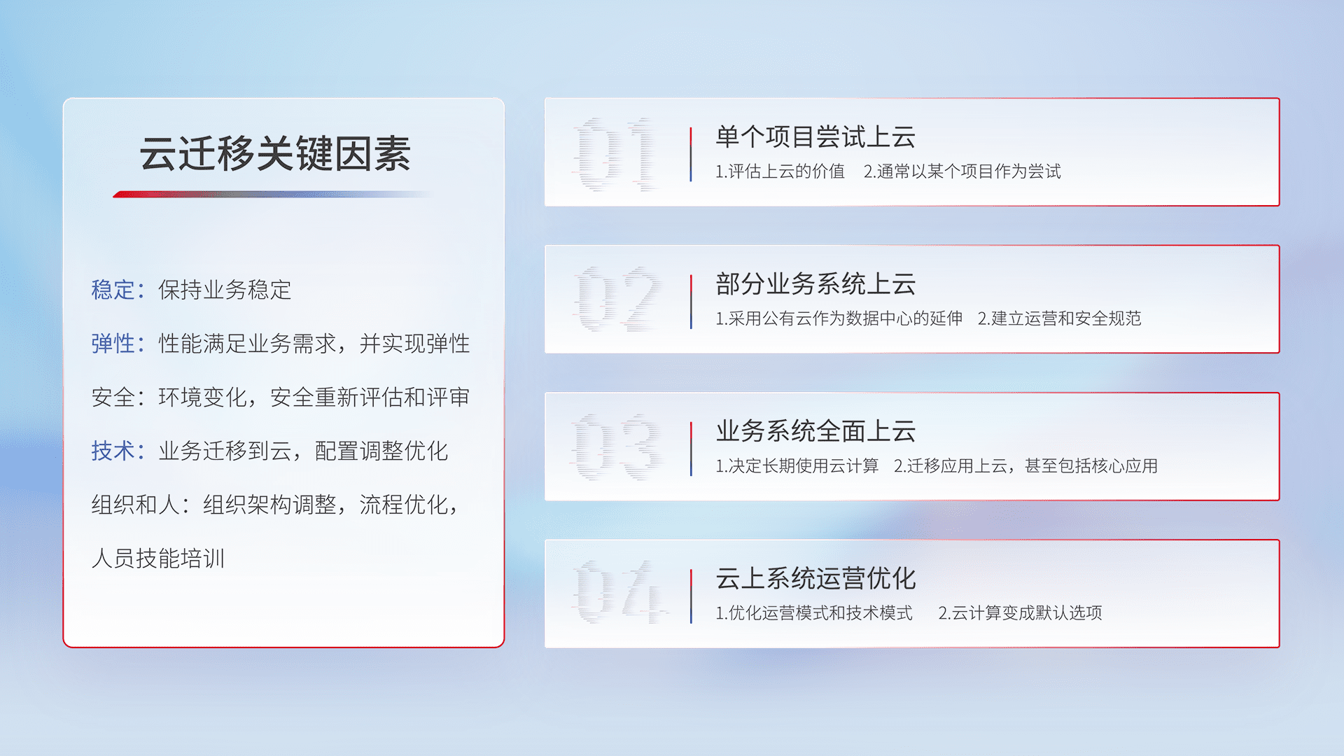 结合实际业务,,,,从规划设计、、、云平台选型、、、云原生改造、、、数据迁移、、集成交付,,,,迁移全过程为客户识别最佳上云路径,,做好风险识别管理,,设计网络架构、、、身份权限、、安全审计合规、、、、操作审计、、、、日志审计、、、监控告警策略、、多站点容灾设计等,,对云上基础设施进行整体规划,,提升IT治理水平,,以满足弹性、、高可用、、高性能的需求。。。