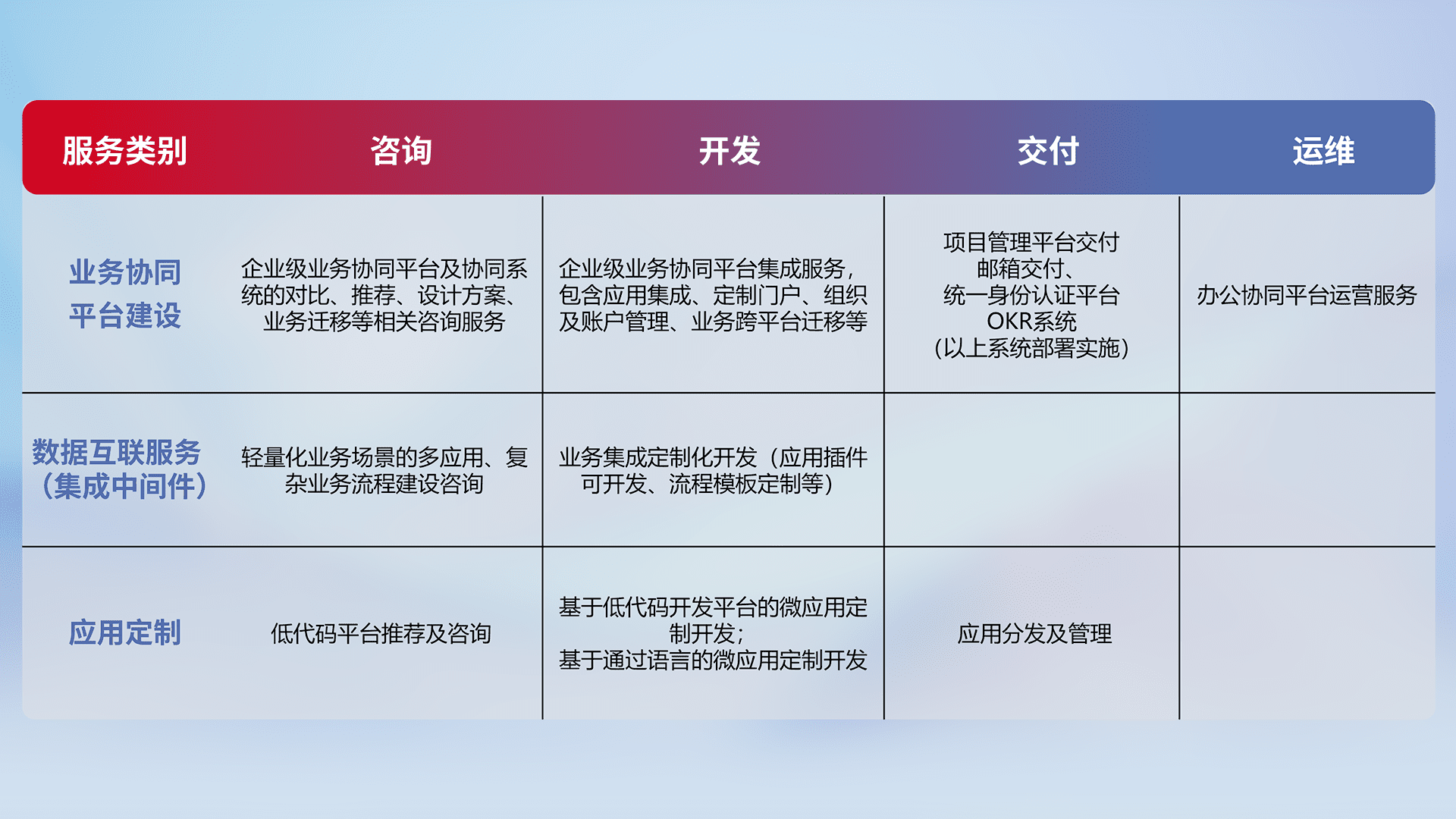 针对钉钉、、、、企微、、IDaas等平台级产品提供产品的规划、、、、方案、、、、交付、、、、定制化开发等服务,,,实现如统一协同办公、、、、智能客户服务、、、混合会议管理、、、、智能数据查询、、等业务场景,,实现数字化转型。。。。